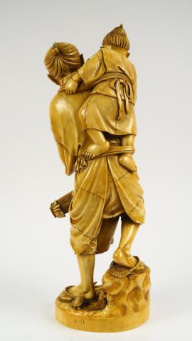 Okimono en ivoire représentant un paysan tenant une ombrelle et une lanterne, indiquant à son enfant qu’un insecte grimpe sur sa manche. Japon, vers 1900-1920. H. 40 cm Poids. 3370 grs Vente aux enchères conforme aux dernières instructions (17/11/2017) du Ministère transmises par le Conseil des Ventes.