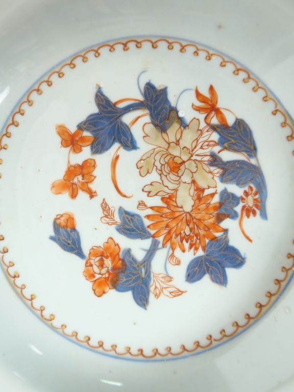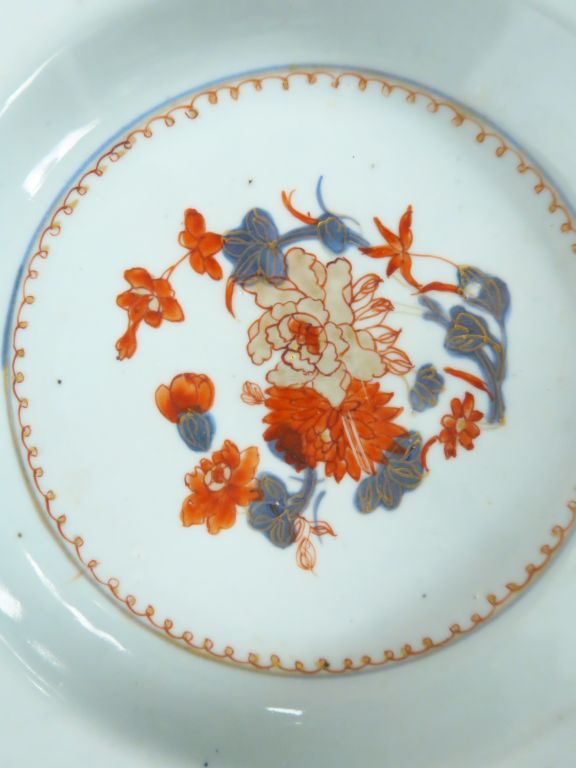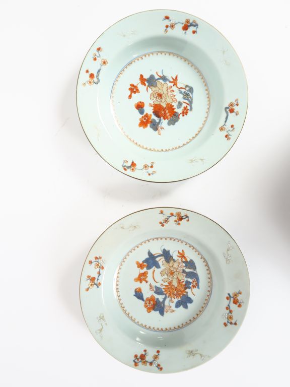 Paire d'assiettes en porcelaine de Commande décor Imari chinois de fleurs. Chine, XVIIIème siècle, période Qianlong. Diam. 23 cm