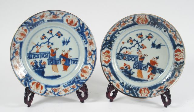 Paire d'assiettes en porcelaine, décor "Imari chinois" de jeunes femmes et d'enfants sur des terrasses arborées ceuillant des fleurs de prunus. Compagnie des Indes XVIIIème. Diam. : 21 et 21,3 cm (égrenure à l'une)