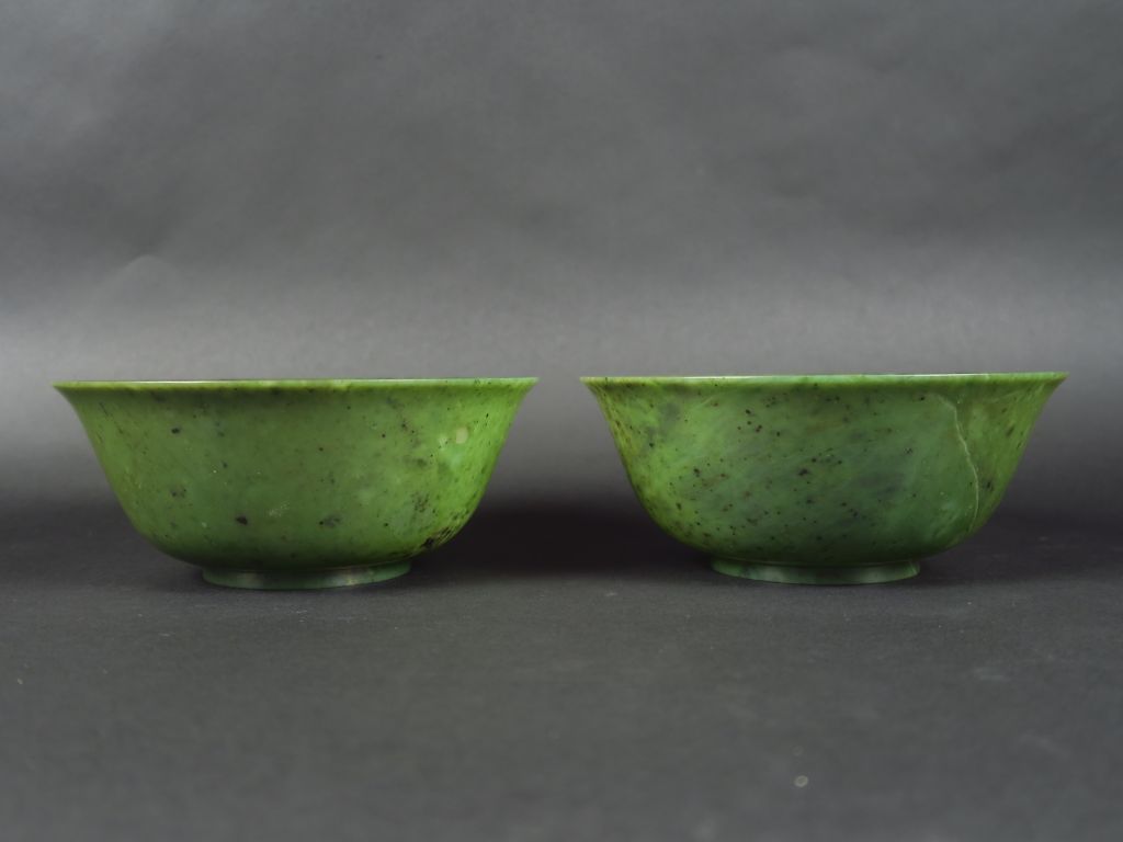 Paire de bols en amphibole vert épinard tacheté de brun, à paroi évasée sur petit talon. Chine, début XXème siècle. H. 8,3 cm Diam. 20,5 cm