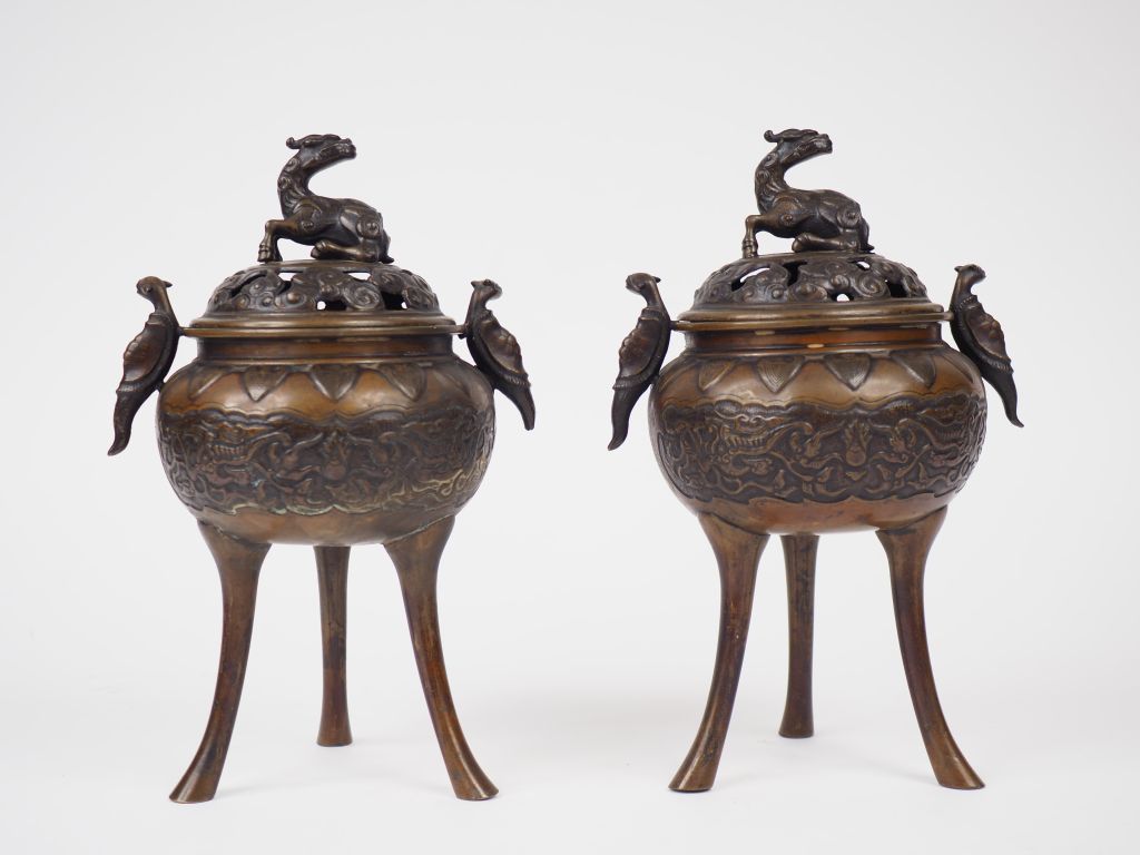 Paire de brûle-parfum tripodes en bronze de patine claire, à décor ciselé de dragons. Des dragons tortues formant anses et un kirin formant la prise du couvercle. Japon, vers 1900. H. 26 cm