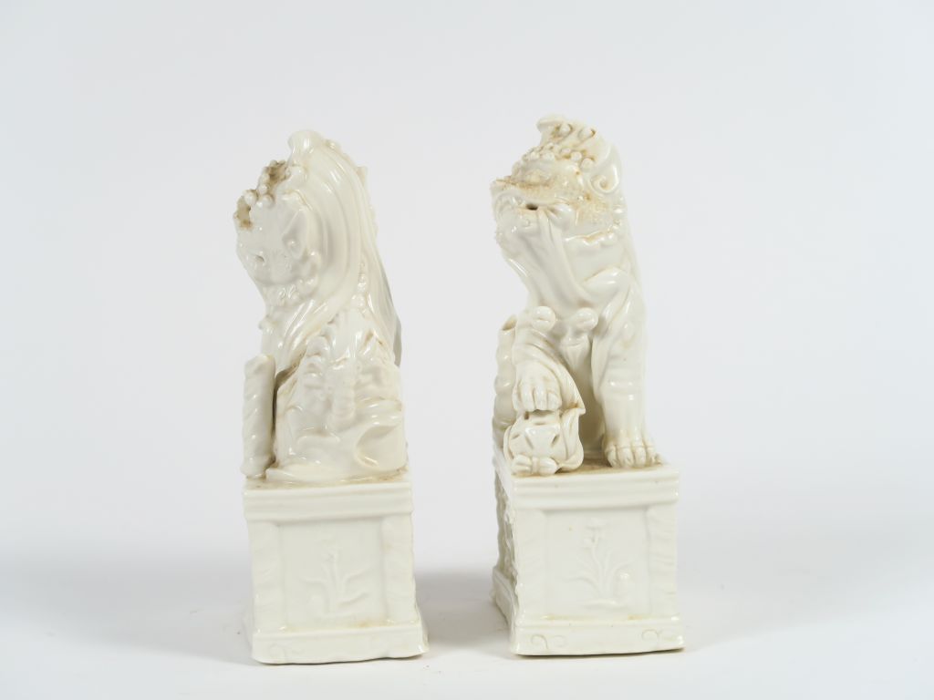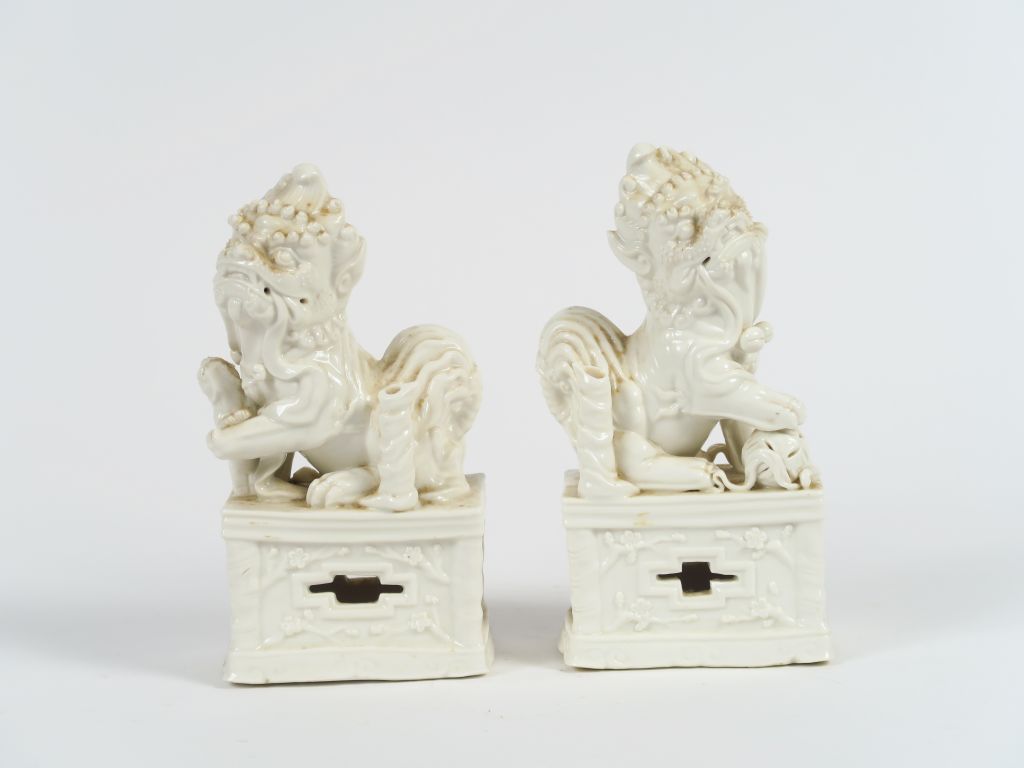 Paire de chien de Fô en porcelaine blanche formant porte baguettes à encens vers 1900. H. 22,5 cm
