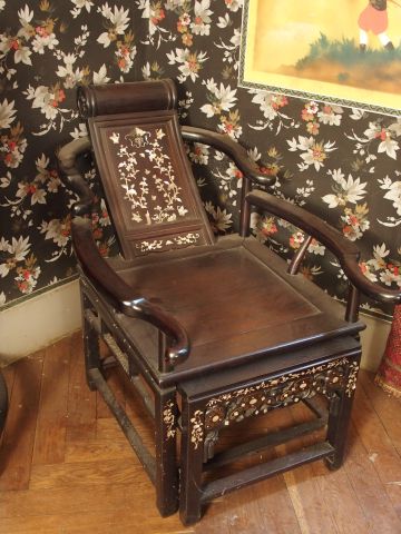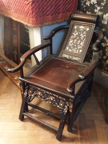 Paire de fauteuils en marqueterie de nacre et acajou avec leur repose pieds. Chine. XIXème