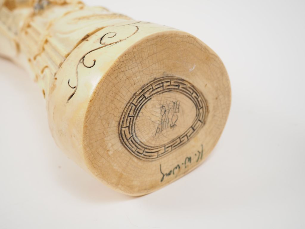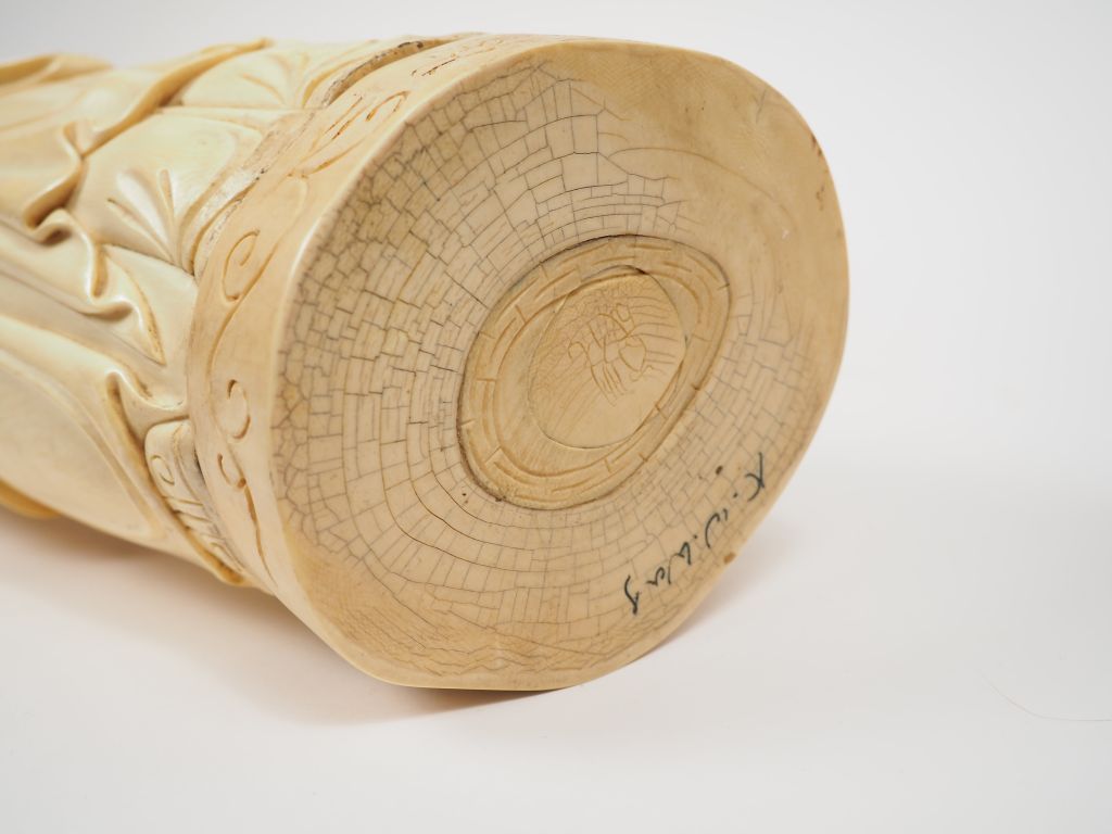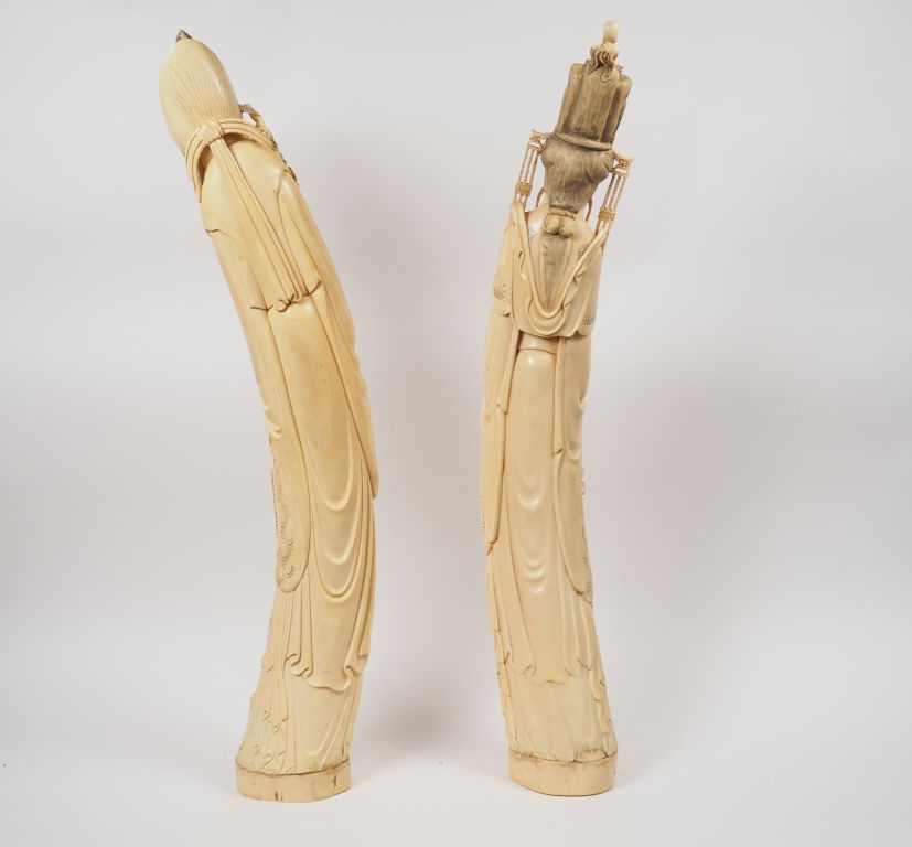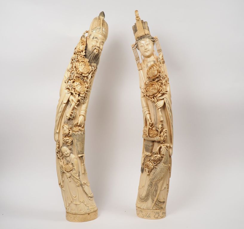 Paire de grandes sculptures sur ivoire représentant un couple de hauts dignitaires tenant des branches de pivoines, la jeune femme accompagnée d'un phoenix, l'homme accompagné d'un enfant. H. 85 cm et 90 cm Poids : 19100 g Nom scientifique de l’ivoire : ivoire d’éléphant Elephantidae spp (I/A, pré-convention), spécimen antérieur au 1er juin 1947 et conforme à la réglementation CE 338/97 du 09/12/1996, art. 2-W mc. Pour une sortie de L’UE, un CITES de ré-export sera nécessaire, celui-ci étant à la charge de l’acquéreur.