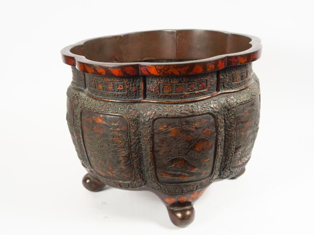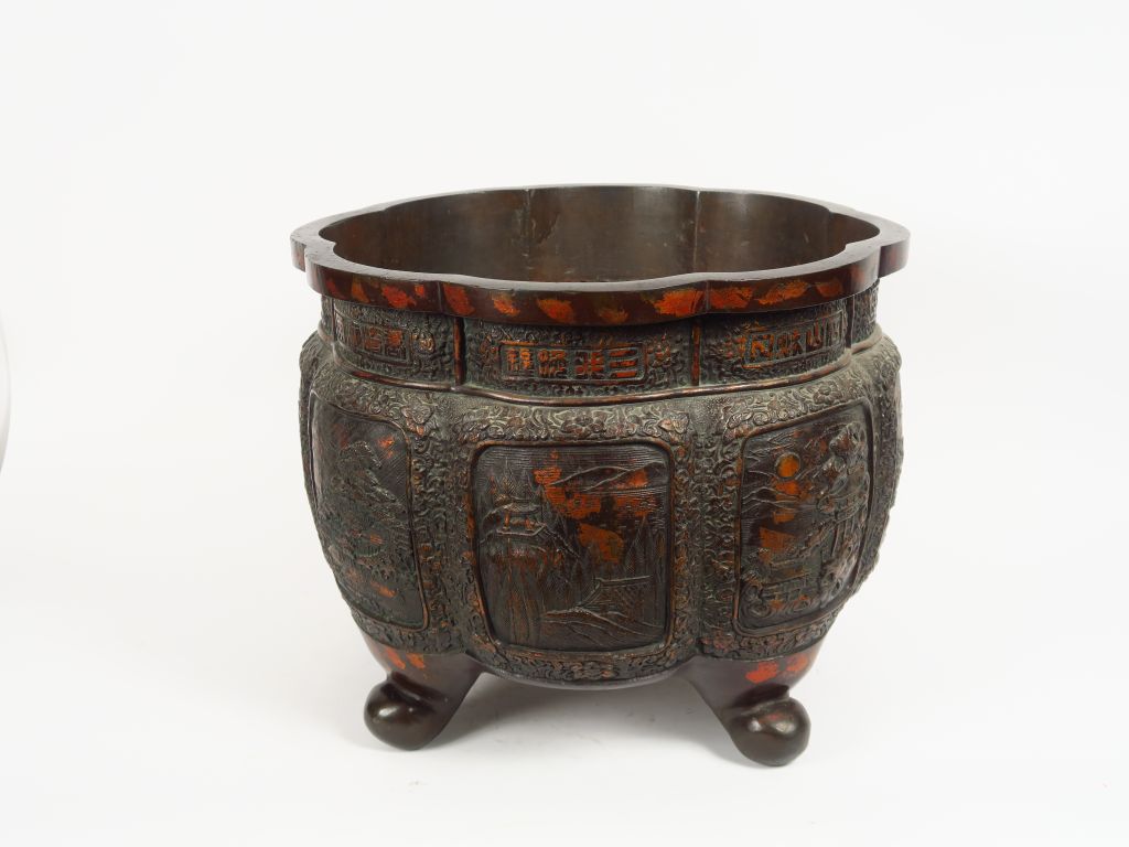 Paire de grandes vasques reposant sur quatre pieds en bronze laqué partiellement dorés à la feuille de bronze, décor en panneaux de scènes paysagées, l'ouverture reprenant la forme d'une fleur avec inscriptions. Chine du Sud. H. 37 cm, Diam. 47 cm.