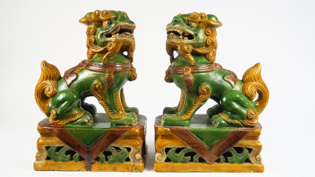 Paire de lions bouddhiques assis sur des terrasses ajourées ornées de motifs de fleurs en céramique et émaux verts et jaunes. Chine, période Qing, XIX ème siècle. H. 38 cm (Petites restaurations)