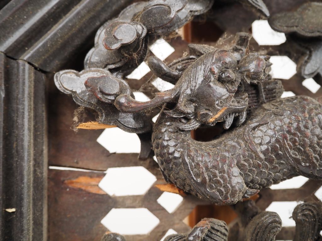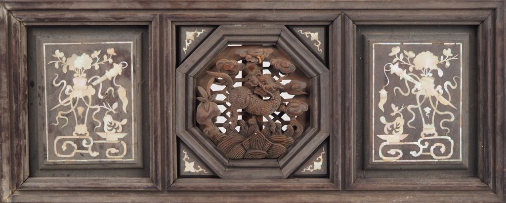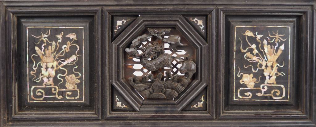 Paire de panneaux en bois sculpté de dragons complété par une marqueterie de nacre représentant des objets mobiliers. Indochine vers1900. Dim. 80 x 32 cm. (petits manques)
