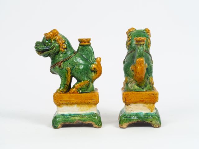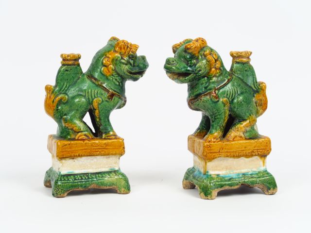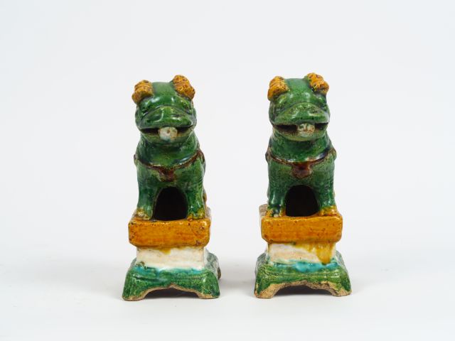 Paire de porte-baguettes à encens en céramique émaillée ocre jaune représentant des lions. Chine vers 1900. H. 20 cm