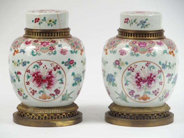 Paire de pots à gimgembre couverts, porcelaine et émaux de la famille rose XVIIIème siècle, monture vers 1900. H. : 26 cm