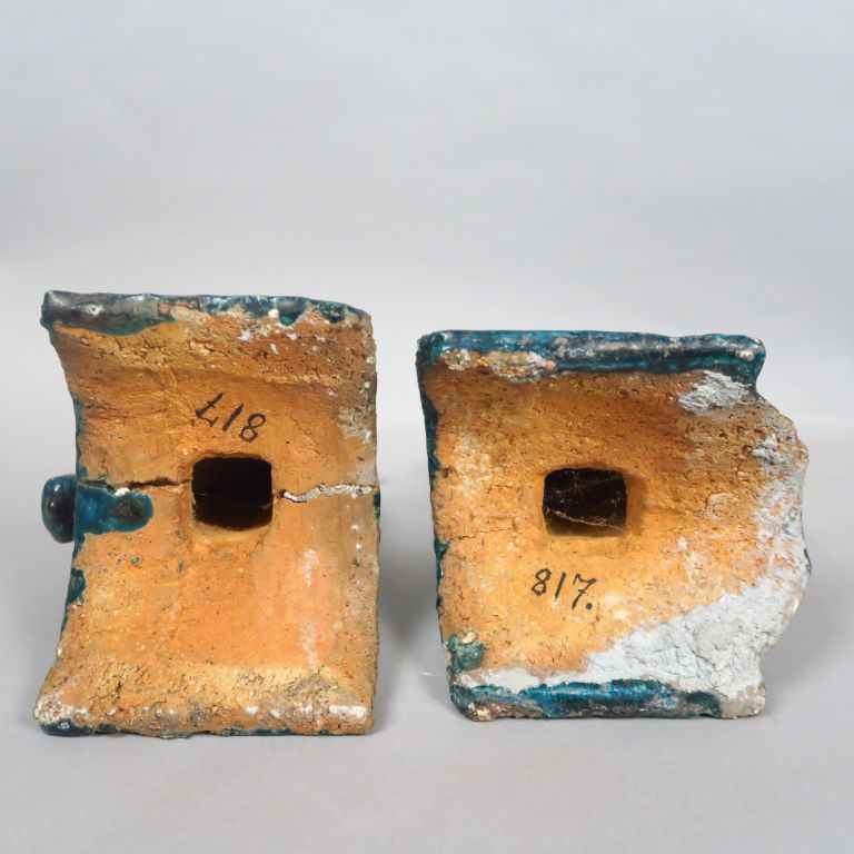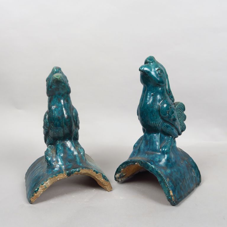 Paire de tuiles faitières en céramique émaillée bleue, représentant des oiseaux. Chine, XVII-XVIIIème siècle. H. 24,5 cm et 24 cm