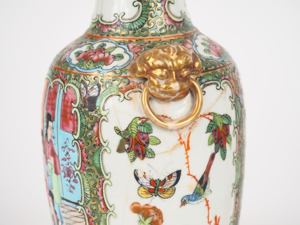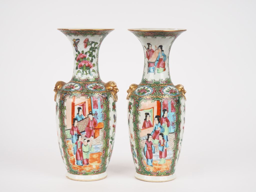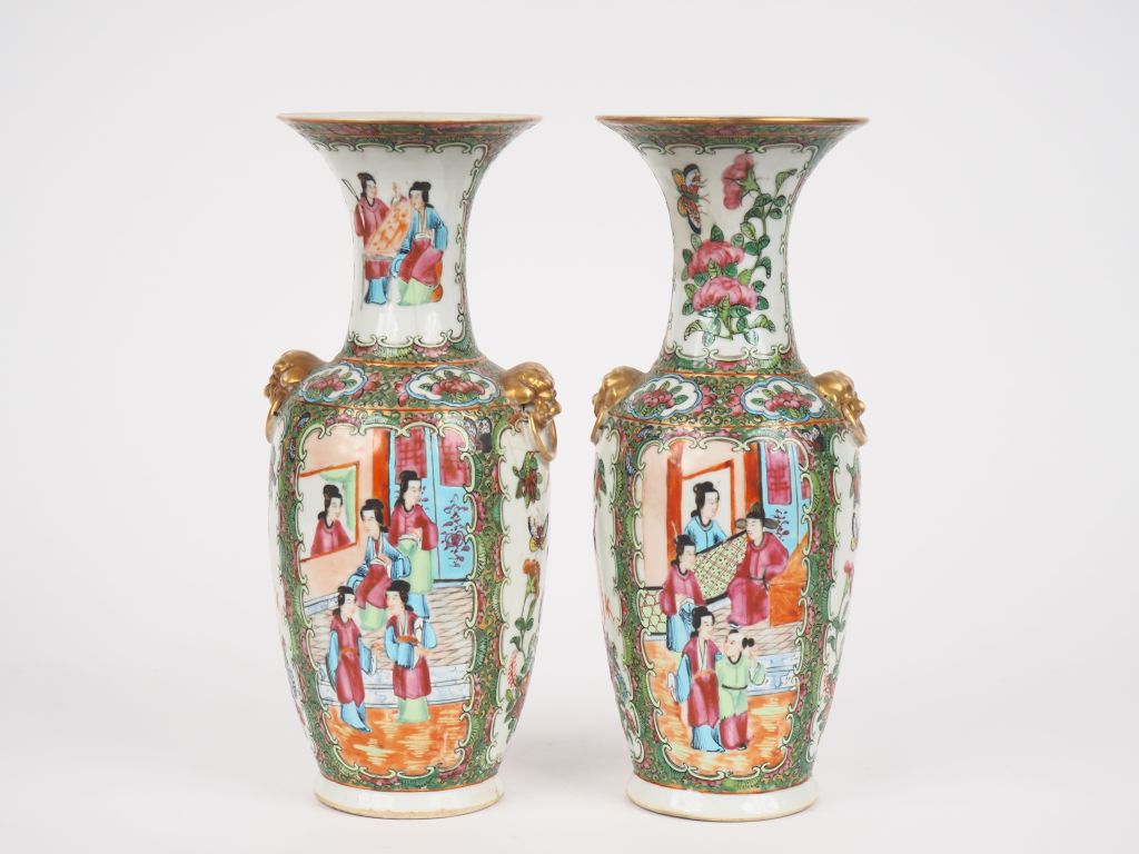 Paire de vases balustre en porcelaine et émaux polychromes de Canton style famille rose. H. 24 cm. (éclat et fels)