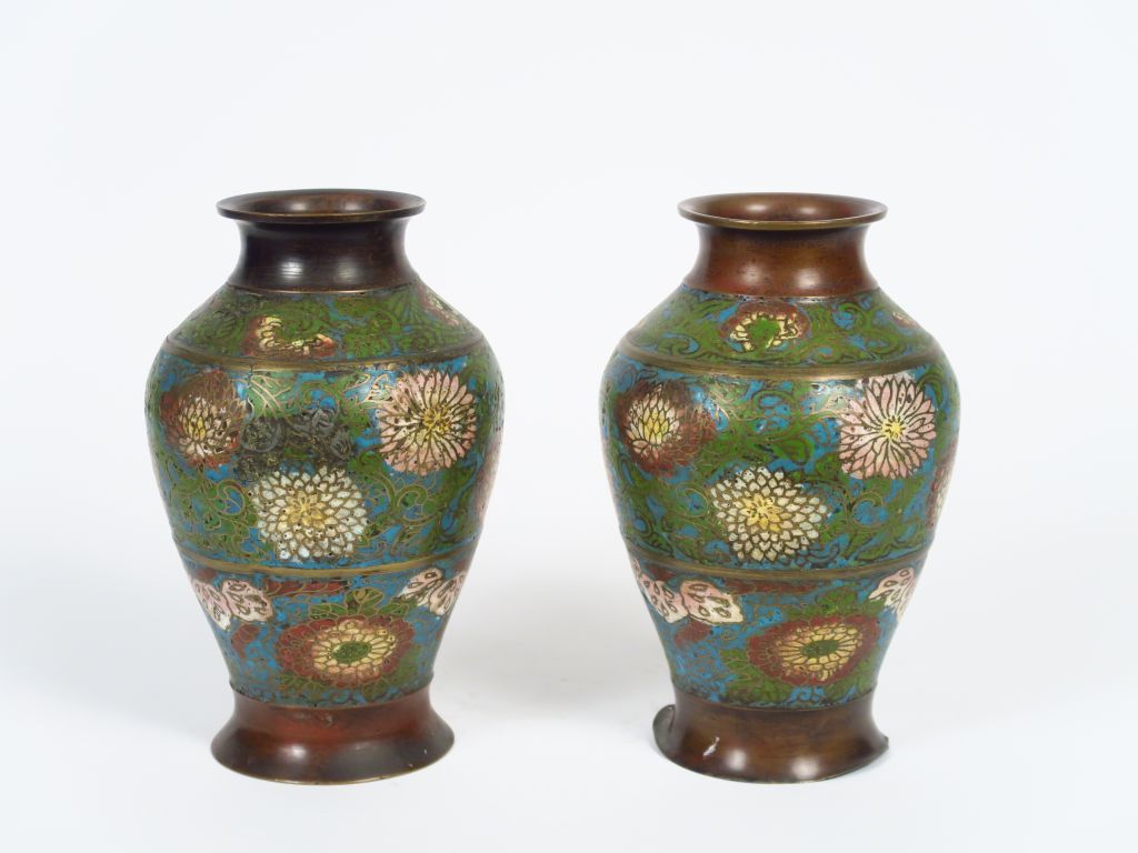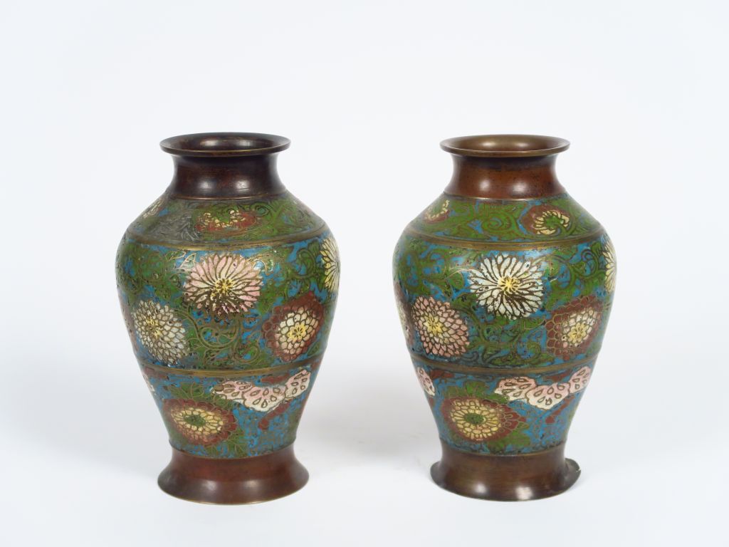 Paire de vases de forme balustre, décor en émaux champlevés polychromes de fleurs. H. 25 cm