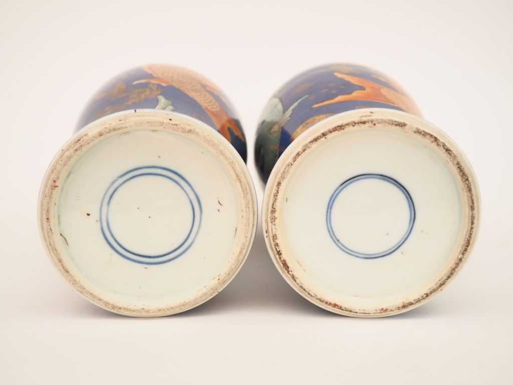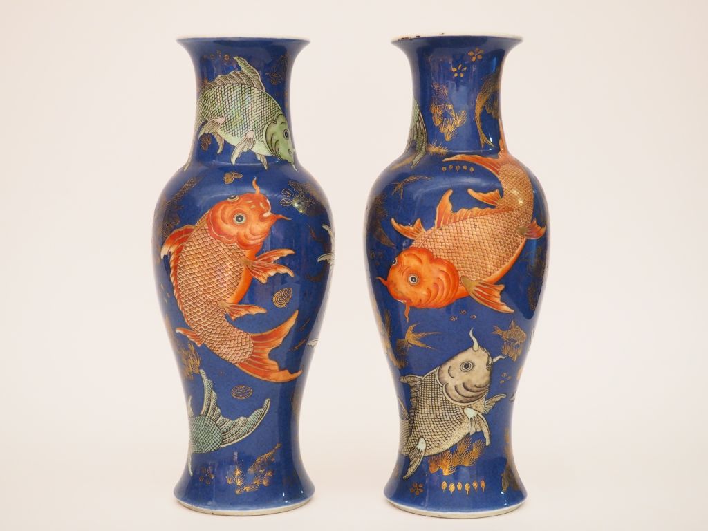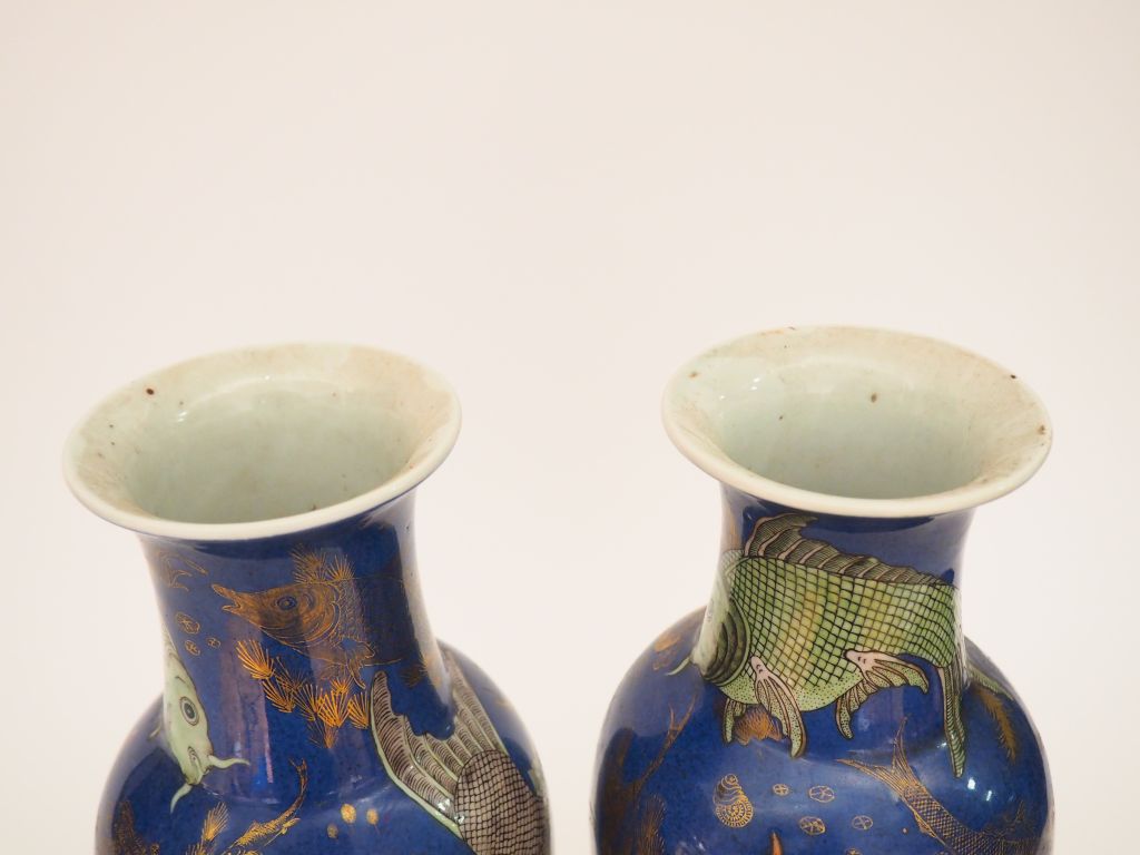 Paire de vases de forme balustre en porcelaine à décor en émaux polychromes de carpes évoluant sur un fond bleu poudré , un second décor avec rehauts d''or représente divers poissons, crustacés, plantes aquatiques et grenouilles. Chine première moitié du XIXème période Daoguang H. 36,5 cm ( rétraction d'émail, fels de cuisson).