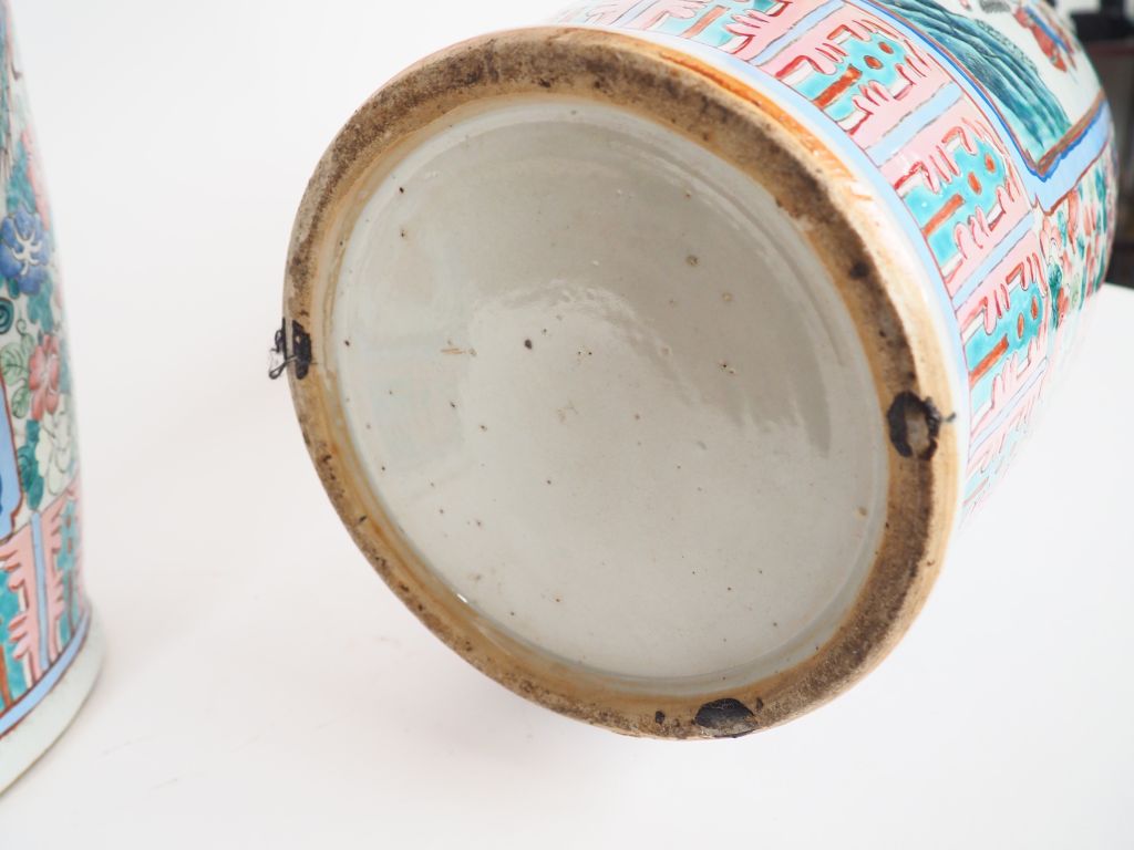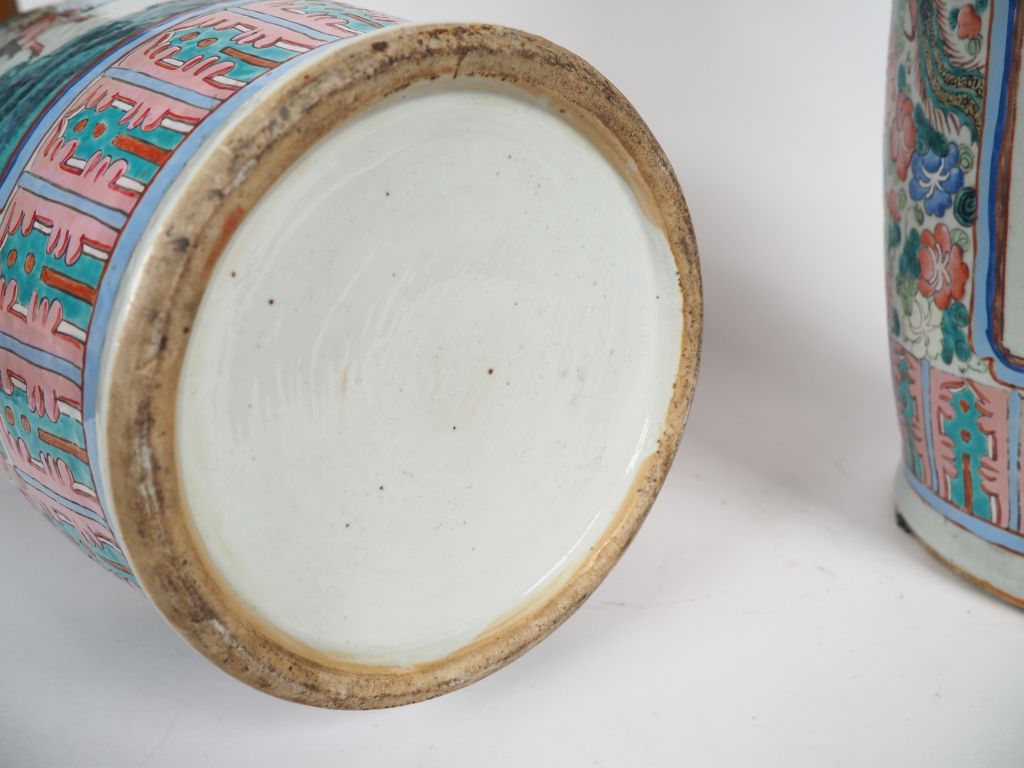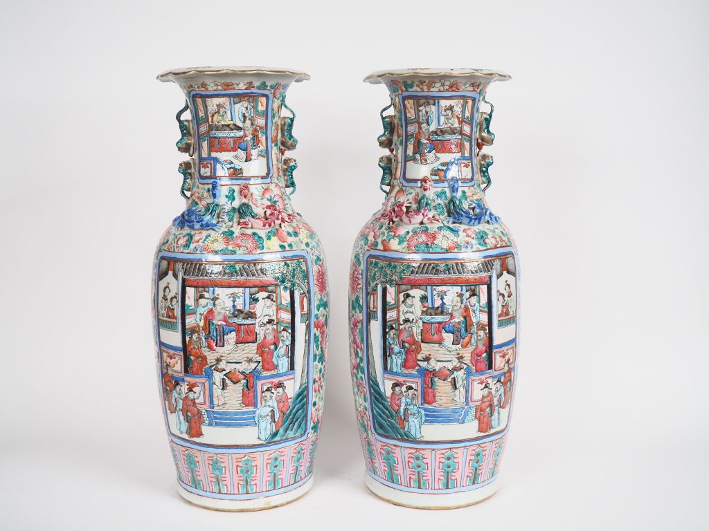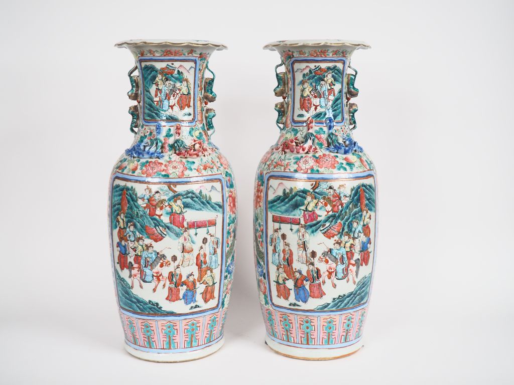 Paire de vases de forme balustre en porcelaine et émaux de la famille rose, décor en médaillon de cérémonie présentant des dignitaires taoistes, des lettrés et l'arrivée d'un dignitaire dans une province, faisans et pivoiniers en fleurs complètent l'ornementation du vase, base du col ornée d'une salamandre. Chine période Guangxu vers 1880 H. 60,5 cm (Egrenure sur l'un des cols).