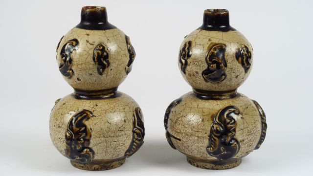Paire de vases doubles gourdes en grès de Cihzou émaillé crémé et ocre à décor appliqué. Chine, dynastie Qing, fin XIX ème siècle. H. 20 cm