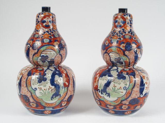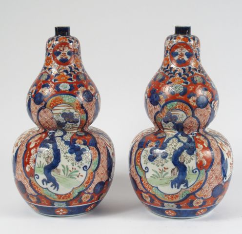 Paire de vases en forme de coloquinte en porcelaine d'Imari, à décor de passementeries de fleurs et de végétaux. Japon vers 1880. H. : 30,5 cm (petites égrenures au col de l'un)
