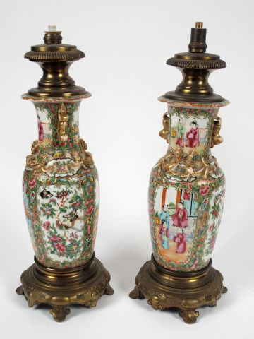 Paire de vases en porcelaine de Canton montés en lampe, décor de personnages dans des réserves, de fleurs, d'oiseaux et de papillons, monture en laiton. Chine, fin XIXe siècle. H. totale : 41 cm