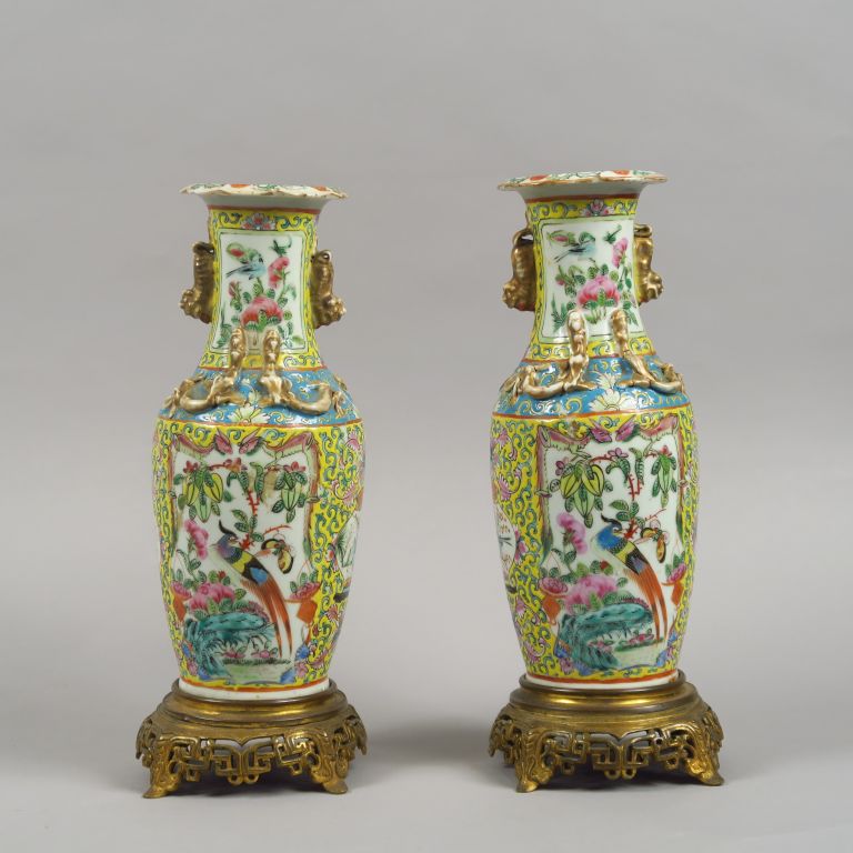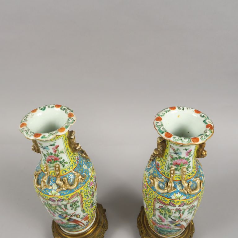 Paire de vases en porcelaine de Canton, monture en bronze doré. Chine, XIXème siècle. H. 30,5 cm (accidents)