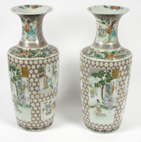 Paire de vases en porcelaine et émaux de la famille rose, à décor dans des réserves de personnages et de lettrés sur fond de fleurettes. Chine, fin XIXe siècle. H. 44,5 cm