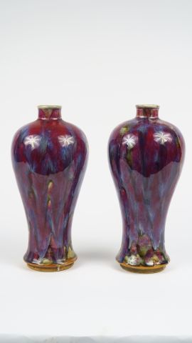 Paire de vases Meiping en grès porcelaineux émaillé sang de boeuf et flammé bleu lavande. Chine, XIX ème siècle. H. 24 cm