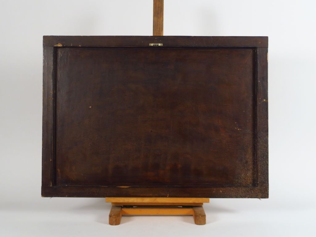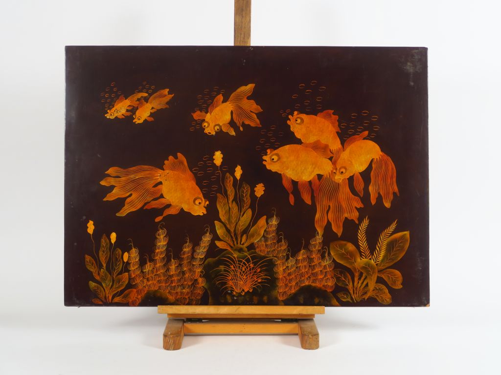 Panneau bois laqué représentant des poissons voile évoluant parmi des plantes aquatiques. Indochine, milieu du XXème siècle. 51 x 70 cm