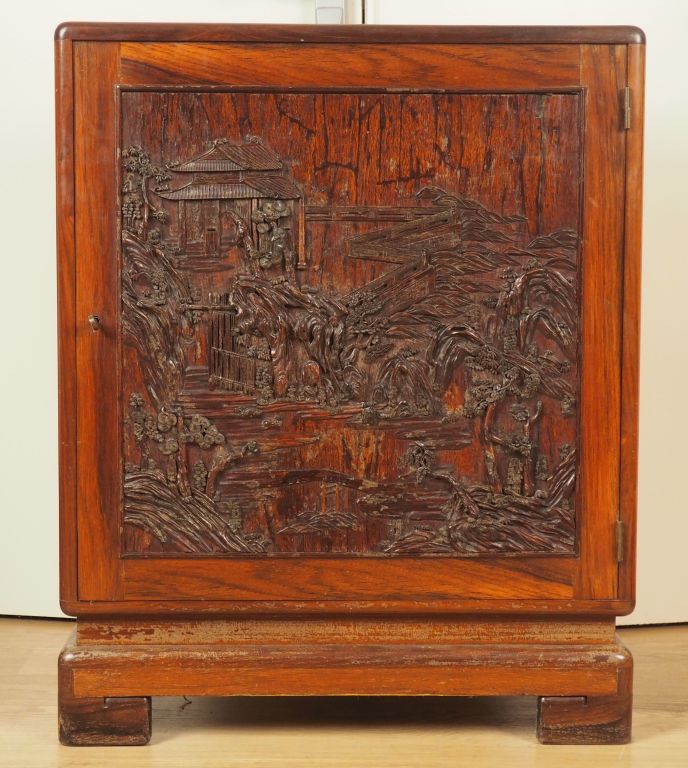 Panneau en bois finement sculpté représentant uin pavillon de lettré dominant le cours d'un fleuve entouré de longévité. Chine XIXème. Monté sur un meuble européen. Dim. (panneau) : 58 x 58 cm.
