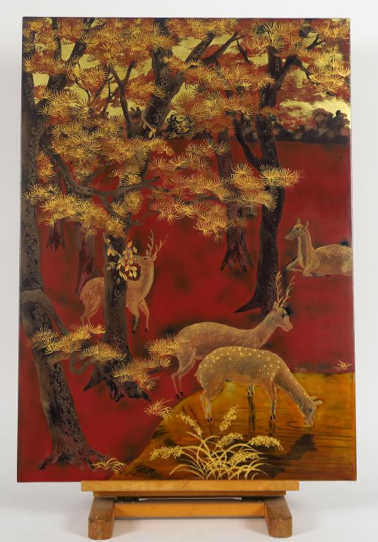 Panneau en bois laqué représentant une colonie de daims au repos sous des pins sur les berges d'une rivière. Indochine, milieu du XXème siècle. 70 x 49,5 cm