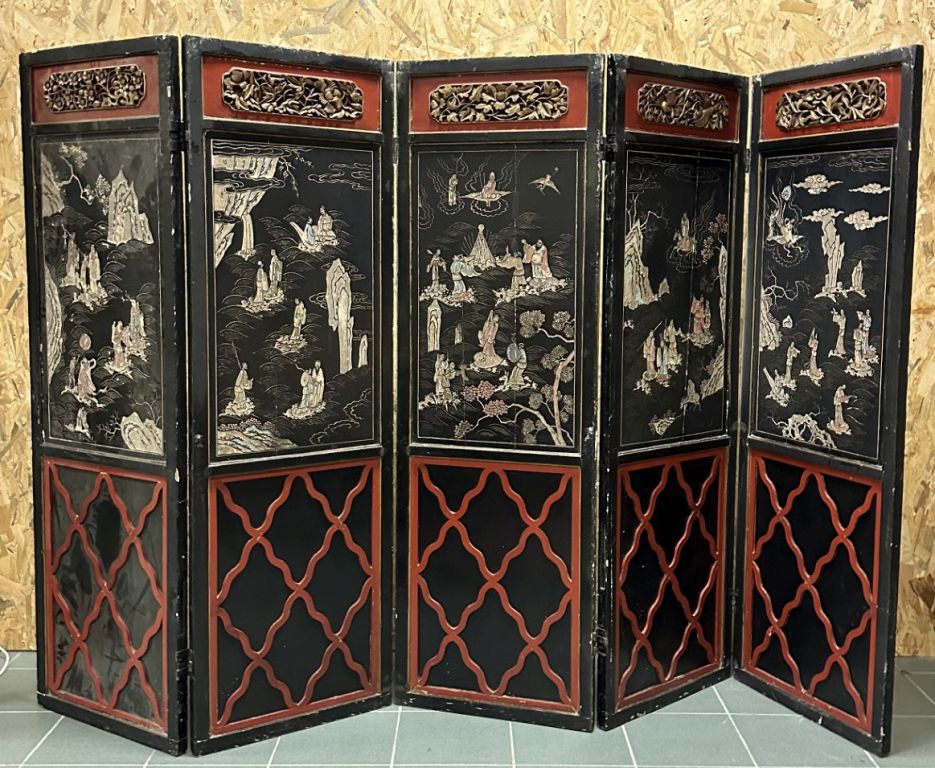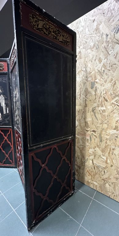 Paravent à 6 feuilles en laque de coromandel, illustrant de scènes légendaires de la mythologie de chinoise, donc la célèbre Xiwang mu. On trouve également des scène d'offrandes auprès de prêtre taoistes. Panneau en bois de Ningbo sculpté d'oiseaux et tiges feuillagées en laque rouge et or. Chine vers 1900. H. 178 x 56 cm (pour chaque brin).