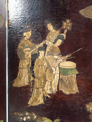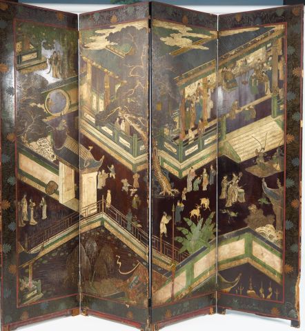 Paravent à quatre feuilles en laque de Coromandel, décor finement gravé figurant la maison d'un mandarin recevant des offrandes, le pourtour décoré de fleurs de lotus, revers calligraphié (usures). Chine, XIXème siècle. H. 188 cm Larg. des feuilles : 51 cm
