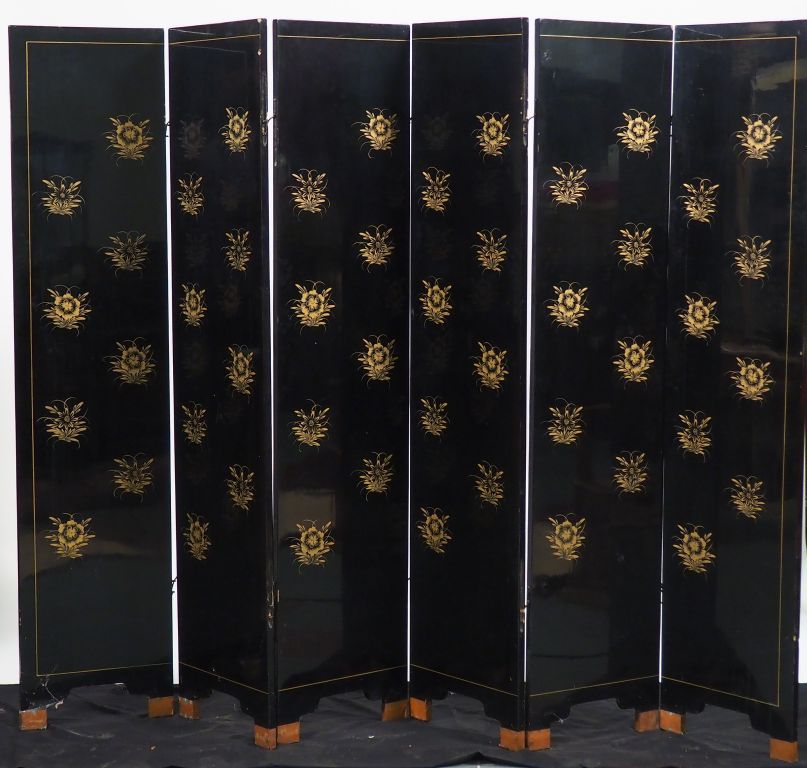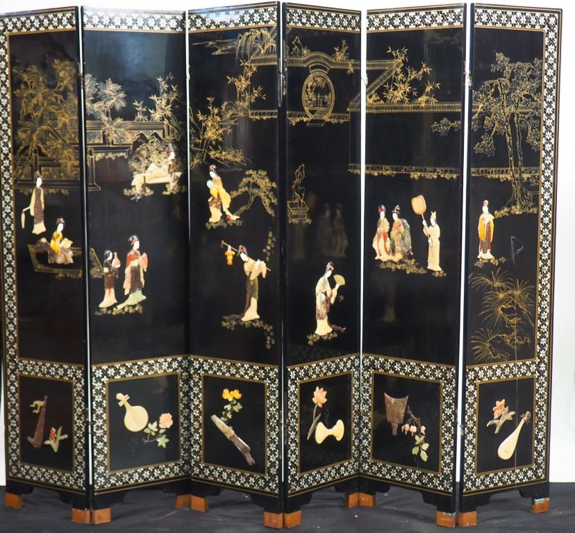 Paravent vers 1960 en laque et stéatite, à décor de personnages , à six feuilles. Dim. d'un brin : 183 x 40,5 cm
