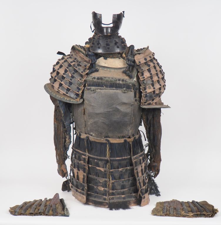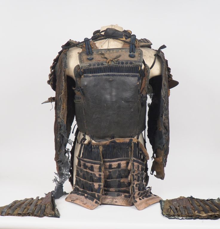 Partie d’armure de guerrier/samourai japonais en fer, acier et lacets en coton bleu marine, constituée d’éléments dont deux épaulières « sode », partie basse du menpo, plastron « do », kusazuri… Accidents et manques. Dim. 88 x 65 cm environ