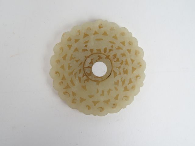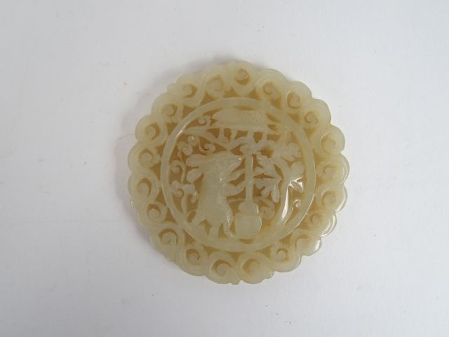 Pendentif de forme circulaire en jade céladon, décor ajouré d'un lapin dans un jardin. Chine XIXème siècle. Diam. : 5 cm