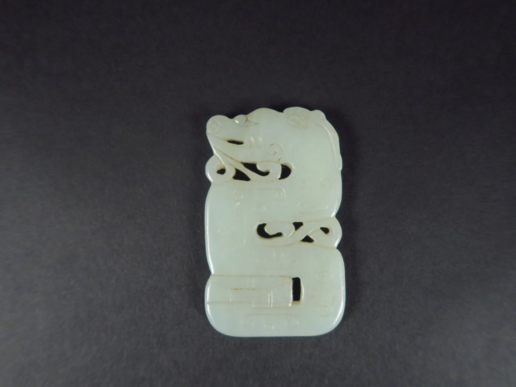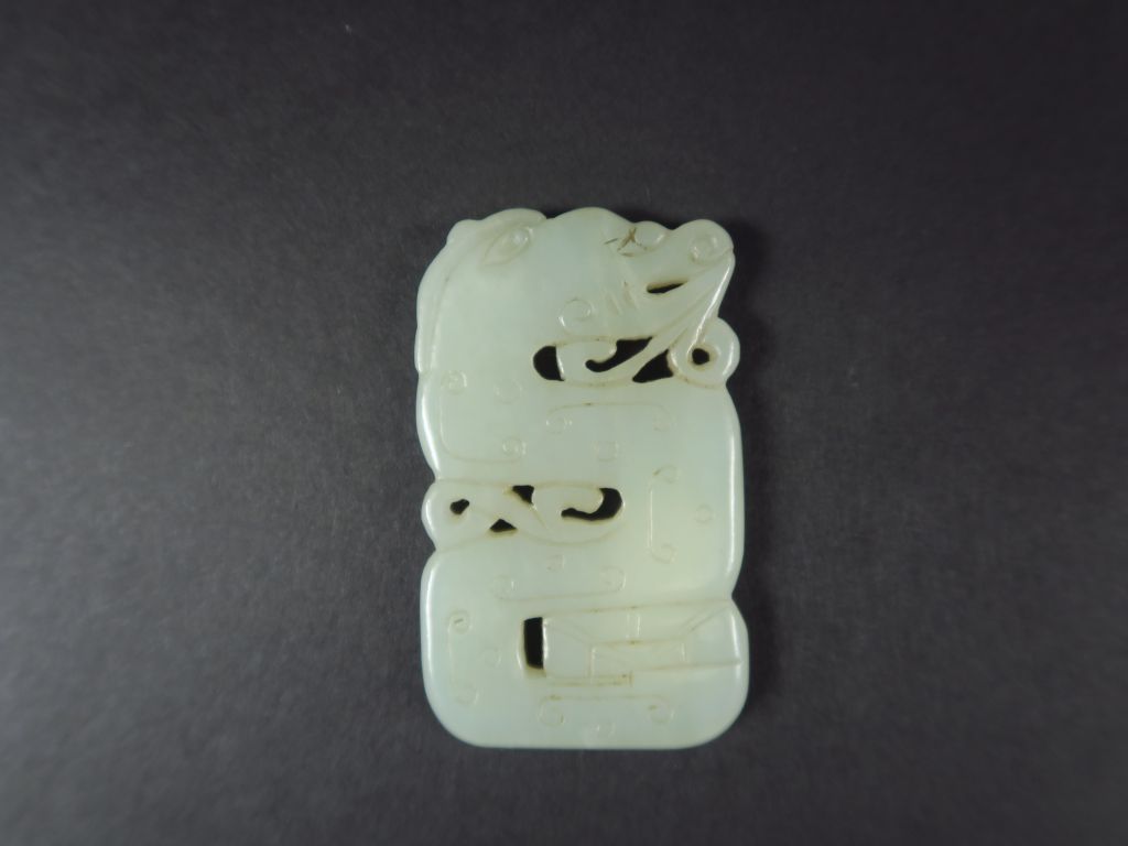 Pendentif en jade blanc celadon, à décor double faces d'un dragon assis sur sa queue. Chine, période Jiaqing. H. 6,7cm