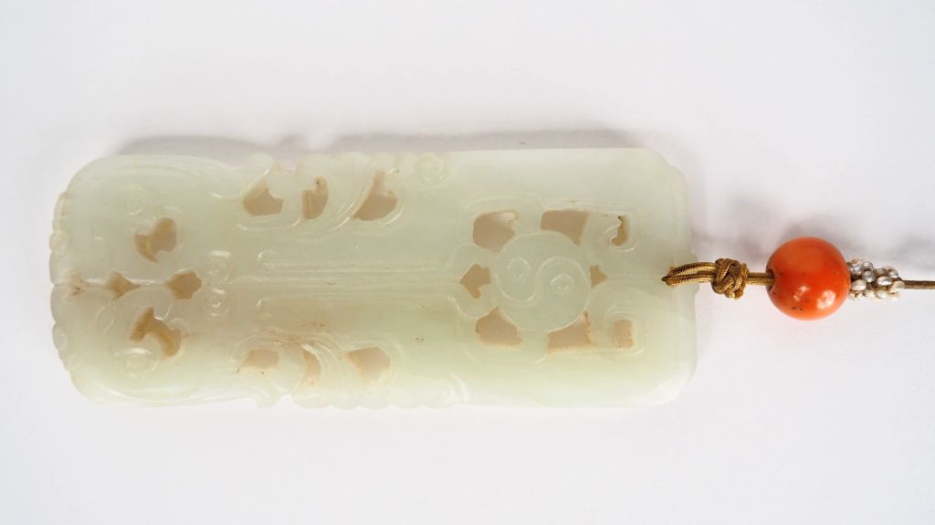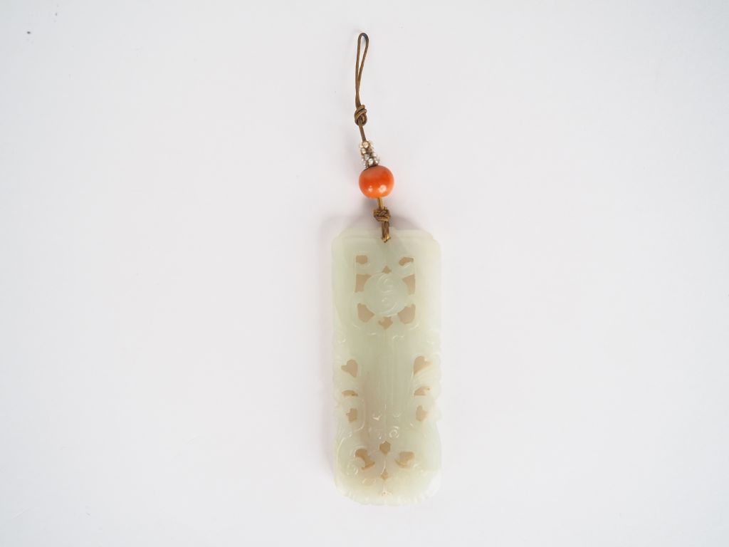 Pendentif en jade céladon représentant un dragon entouré de deux phénix tenant le Taiji Chine XIXème H. 8,2 cm
