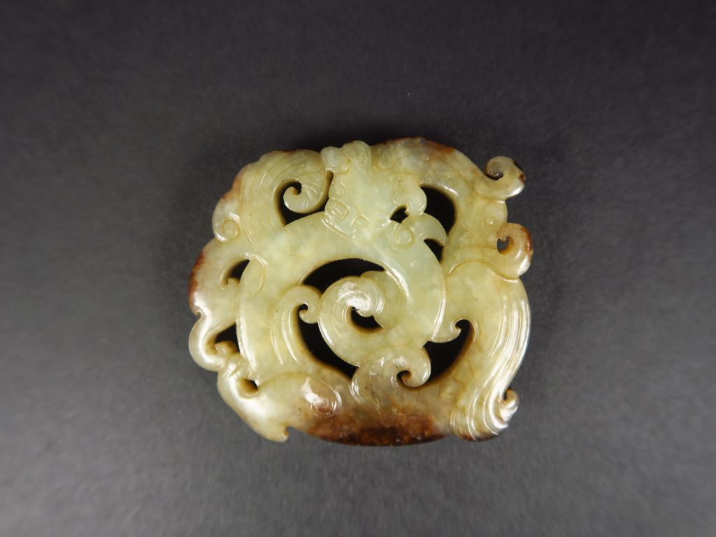Pendentif en jade jaune représentant un dragon lové. Chine, XVIIIème siècle. Long. 6 cm
