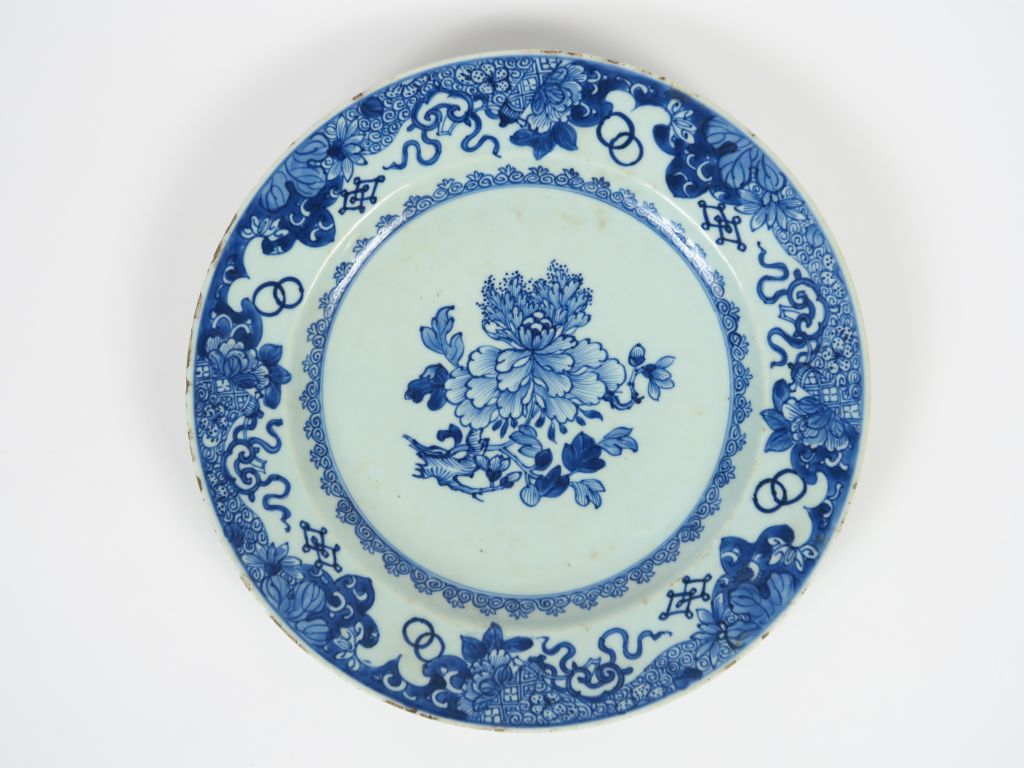 Petit plat en porcelaine bleu blanc de commande, à décor de fleurs et de lambrequins. Chine vers Qianlong XVIIIème (petites égrenures). Diam. 32 cm