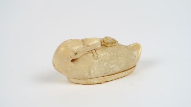 Petite boite couverte en ivoire qui reprend la forme d'un canard tenant une fleur de lotus. Chine, vers 1930. L. 7,8 cm Vente aux enchères conforme aux dernières instructions (17/11/2017) du Ministère transmises par le Conseil des Ventes.