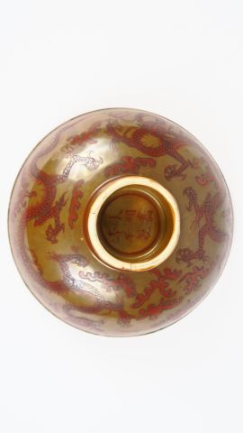 Petite coupe sur pied en porcelaine à décor rouge d'un dragon sur couverte café au lait, cerclée de cuivre. Marque apocryphe Xuande. Chine, XVIII ème siècle. Diam. 15,5 cm