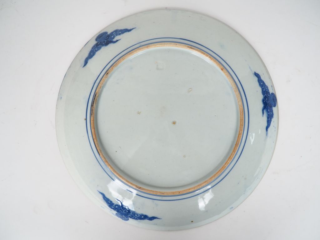 Plat en porcelaine à décor au pochoir en camaïeu de bleu d'un paysage lacustre Diam. 37,5 cm.