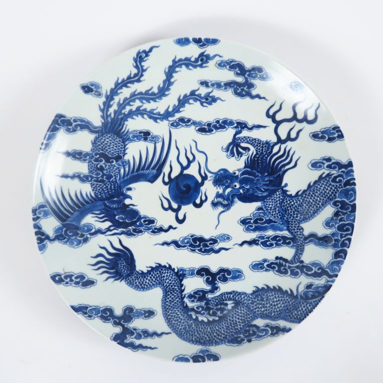 Plat en porcelaine, à décor de phenix et de dragon poursuivant la perle sacrée. Marque de la longévité sous la base. Vietnam, Xxème siècle. Diam. 36 cm (défaut de cuisson sur la marque, égrenures sur le talon)