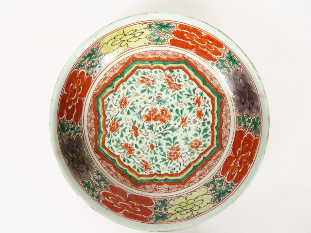 Plat en porcelaine et émaux de la famille verte, médaillon central en forme de fleur de lotus, décor de fleurettes. Chine, XVIIème siècle. Diam. 32,5 cm