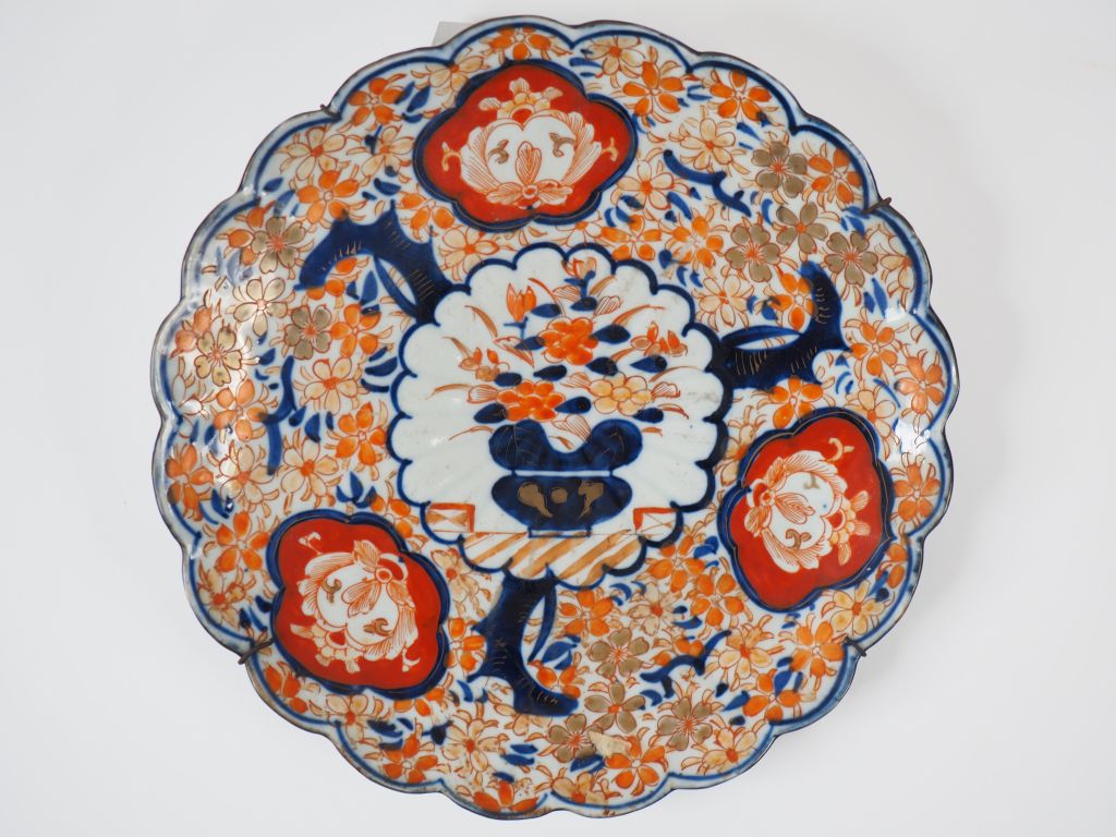 Plat floriforme en porcelaine d'Imari, décor en bleu, corail et or de compositions florales. Japon, vers 1920. Diam. 31 cm