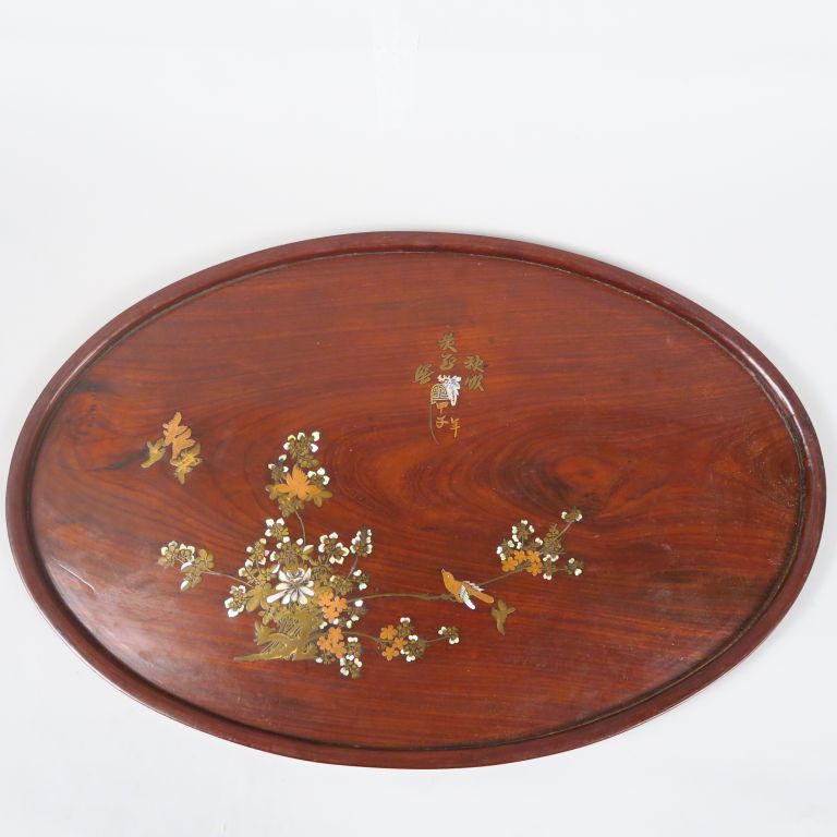 Plateau ovale en bois, à décor en marqueterie de laiton et de nacre d'oiseaux et de branchages fleuris. Japon. 36 x 54 cm