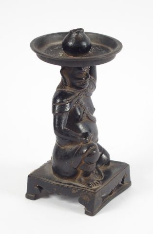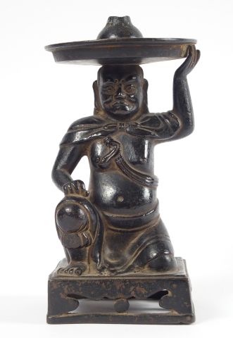 Porte baguettes à encens en bronze représentant un serviteur portant une coupe. Chine XVIIème siècle, période Ming. H. : 18,5 cm (petit manque au niveau du bougeoir)