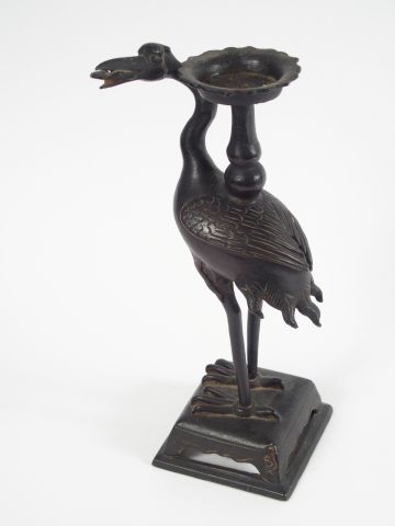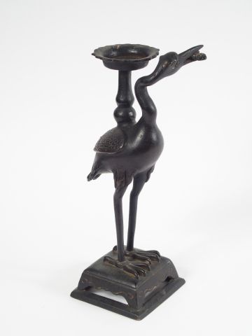 Porte-cierge en bronze à patine brune, figurant un échassier supportant un vase. Chine XVIIIème siècle. H. : 28,5 cm