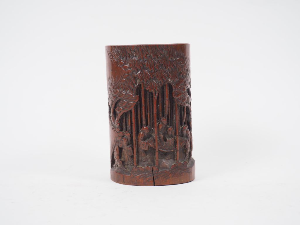 Porte pinceaux en bambou à décor de sage dans une forêt de bambou. Chine, vers 1900. H. 16,5 cm