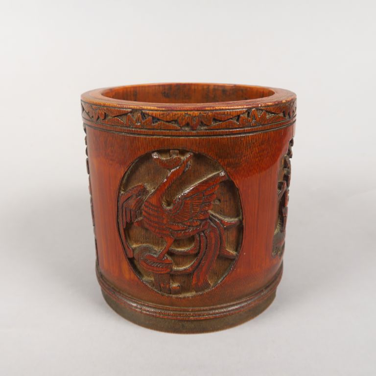 Pot à tabac en bambou, à décor sculpté de personnages et d'animaux en médaillon. Chine, vers 1920. H. 11,5 cm