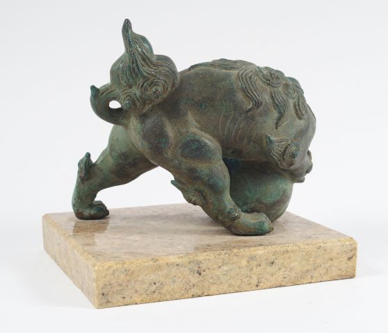 Presse-papier dont la prise est formée d'un shishi en bronze à patine verte. Japon vers 1900. H. : 16 cm