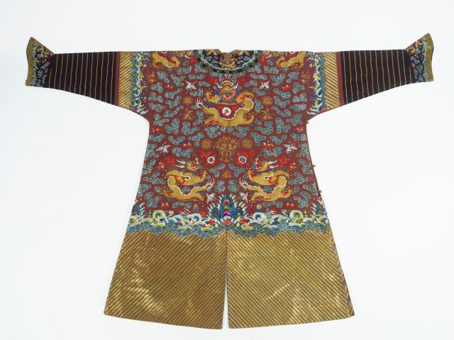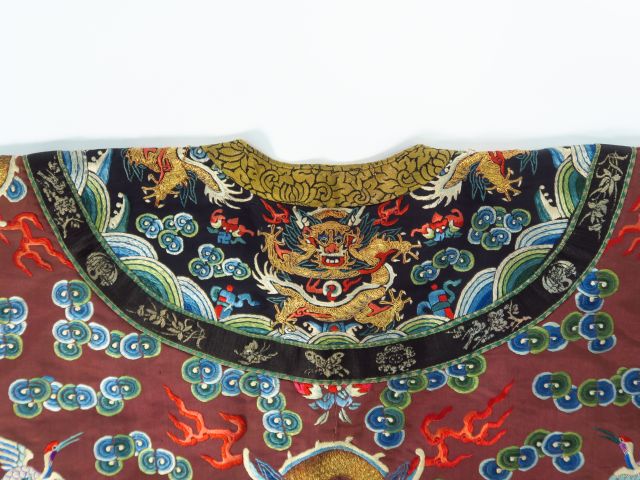 Robe de cérémonie en soie et lin brodé, polychromie et fil d'or reposant sur un fond brun, décor de neuf dragons à cinq griffes suivant la perle sacrée dans des nuages stylisés, echassiers, chauves souris, branche de corail. Chine, période Guanxu.