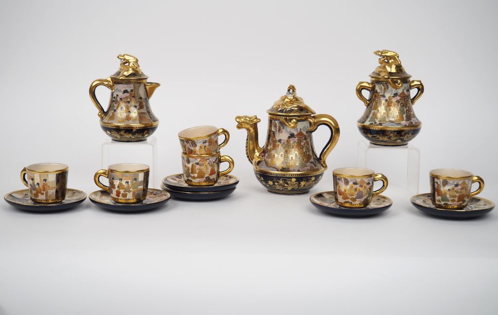 Satsuma, vers 1920 Service à thé comprenant quinze pièce en porcelaine dont six tasses et sous tasses, une theière, verseuse et pot à sucre à décor de arrhat et geishas. H. 20 cm pour la theière
